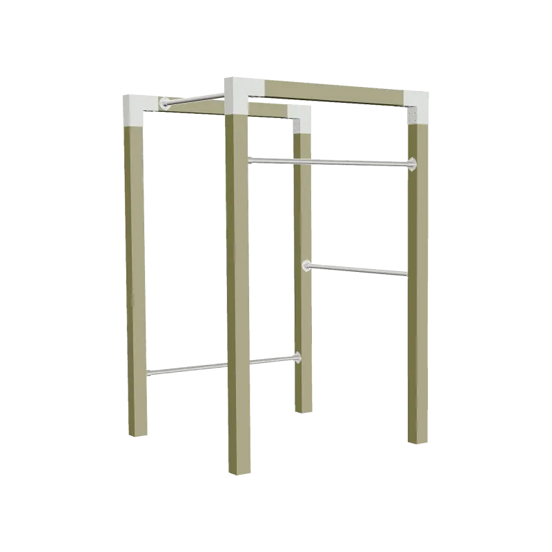 Plus Outdoor fitness – Model 1 – TrykimprægneretVarenr. består af: Stolper og cubic beslag inkl. skruer samt stålrør. Stolper: Omlimede træstolper 99298 cm til nedgravning. Trykimprægneret NTR mærket klasse A. Det betyder, at den er effektivt beskyt
